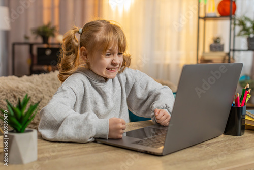 Young girl sitting at a table with a laptop, feeling frustrated after losing a game at home. Caucasian child showing disappointment with an upset expression, reflecting emotions of failure and sadness