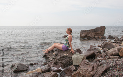 young girl sitting on coastal stones by the sea
