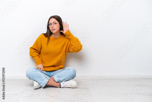 Young girl sitting on the floor isolated on white background listening to something by putting hand on the ear