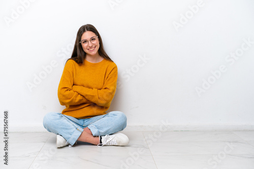 Young girl sitting on the floor isolated on white background with arms crossed and looking forward