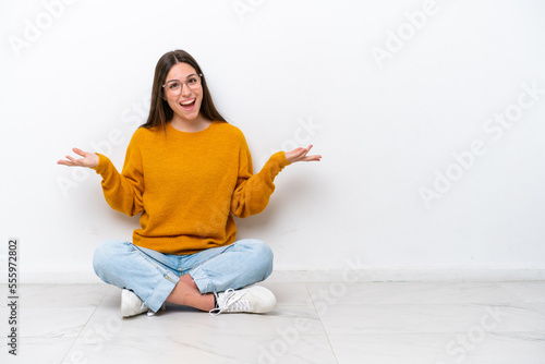 Young girl sitting on the floor isolated on white background with shocked facial expression