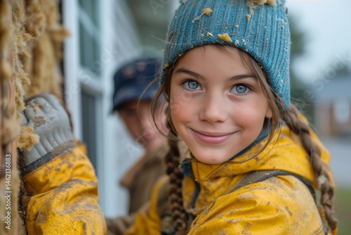 Young girl smiling while working on a home renovation project in a residential neighborhood during cloudy weather