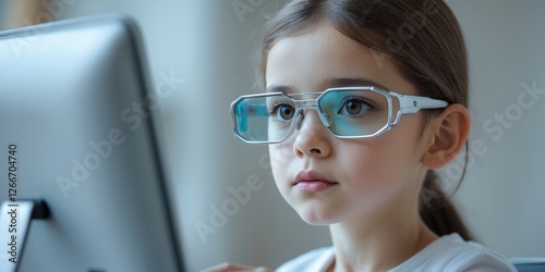 Young girl wearing smart glasses while looking attentively at a digital screen indoors