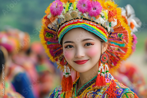 Young girl wearing traditional chinese dress smiling during celebrations in the street generative ai