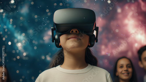 Young girl wearing VR headset, immersed in bright space with friends, exploring new worlds and enjoying magical experience together