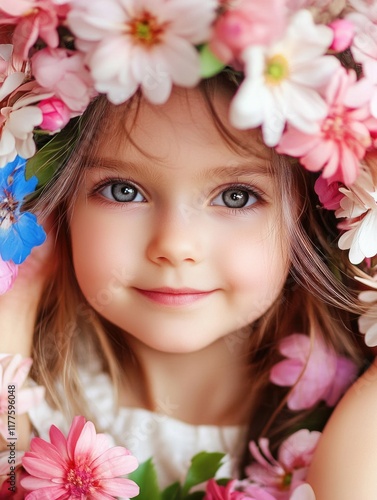 Young girl with a floral crown surrounded by vibrant pink and blue flowers, smiling softly, with a bright and airy background for custom text.