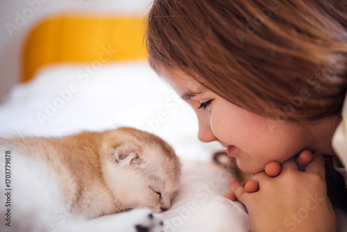 Young girl with brown hair is smiling at a sleeping cat on a bed, showcasing a tender moment of connection and affection between child and pet in a cozy environment
