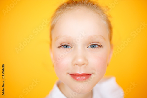 Young girl with plain pure sking and strong blonde fair hair. Hand on hairs. Little girl smiling in camera. Beautiful Studio portait of young child.