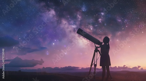 Young girl with telescope observing stars, astronomy hobby, stargazing night