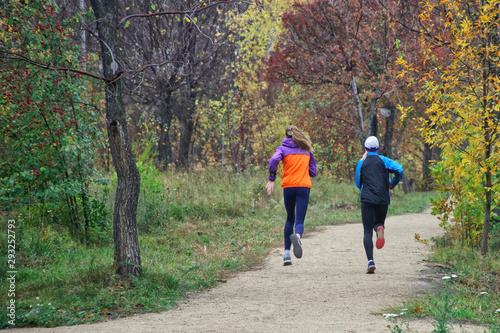 Young girls are training on the run in the autumn park alley. Activity and sport. Unrecognizable
