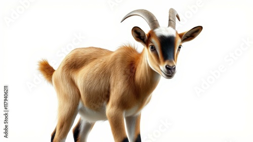 Young goat stands calmly against a plain background showcasing its playful demeanor and distinct features during a sunny day