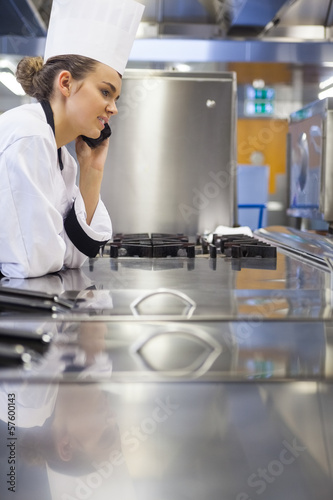 Young gorgeous chef standing next to work surface phoning