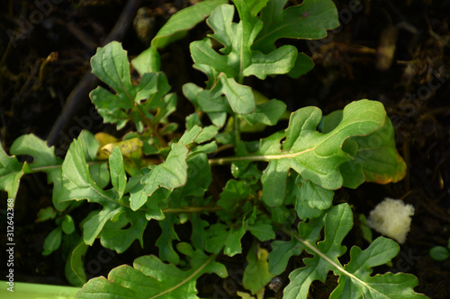 young green and red rucola leaves in a pot, potted rocket salad in garden