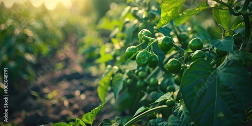 Young green pepper drupes on the vine in a rustic farm environment.