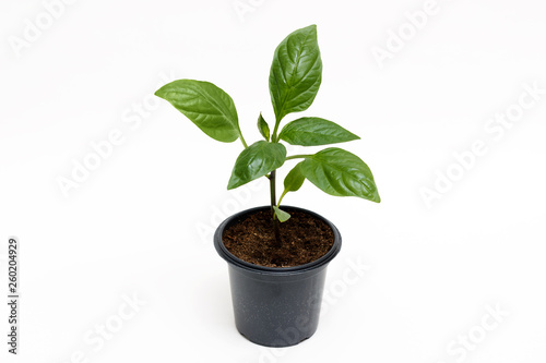 Young green plant grows in a pot for seedlings, isolated on a white background. Sprout pepper.