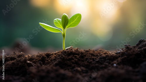 Young green sapling plant growing from the earth.