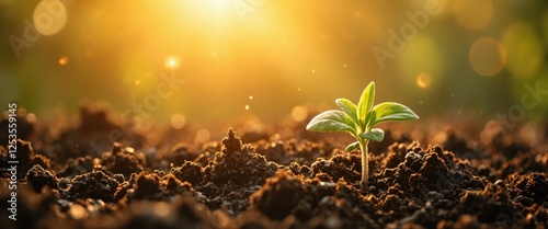 Young green seedling sprouting from fertile soil under warm sunlight. Macro shot with bokeh background. Growth and nature concept.