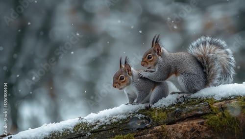 Young grey squirrels sitting together on a tree limb, highlighting wildlife behavior and natural environment