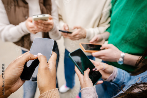 Young group of people using mobile phones, text message on cell app. Social media and technology lifestyle concept