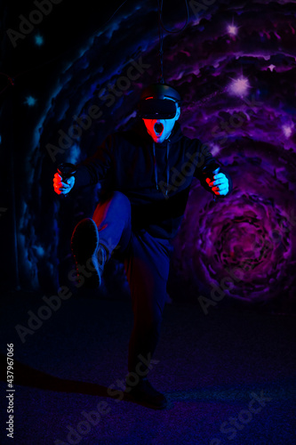Young guy in the playroom wearing virtual reality glasses. VR.