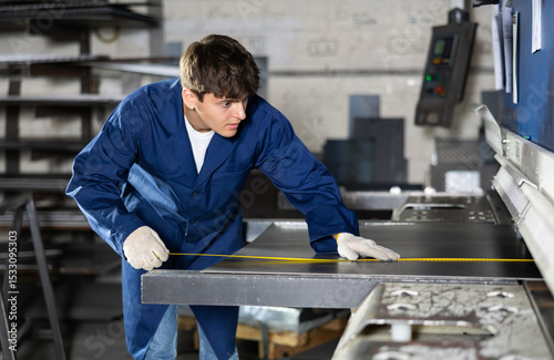 Young guy worker measures sheet of metal with tape measure in metallurgical workshop