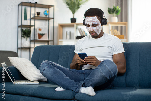 Young handsome African American man with facial mask on face, wearing headphones, sitting on sofa at home and listening to music choosing favourite song from smartphone playlist