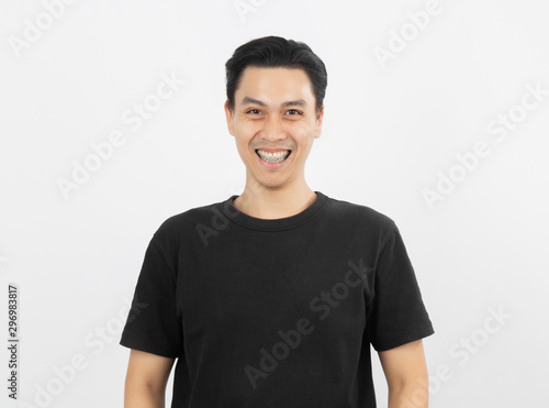 Young handsome asian man smiling with braces and looking at camera isolated on white background.