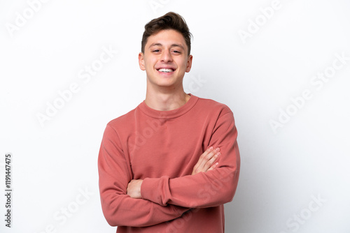 Young handsome Brazilian man isolated on white background keeping the arms crossed in frontal position