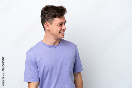 Young handsome Brazilian man isolated on white background looking to the side and smiling