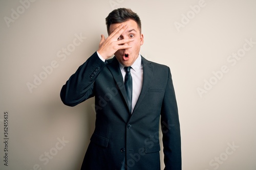 Young handsome business man wearing elegant suit and tie over isolated background peeking in shock covering face and eyes with hand, looking through fingers with embarrassed expression.