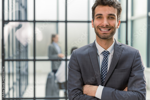 Young handsome businessman smiling in an office environment. Collegues are on the background.