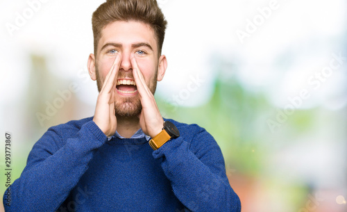 Young handsome bussines man Shouting angry out loud with hands over mouth