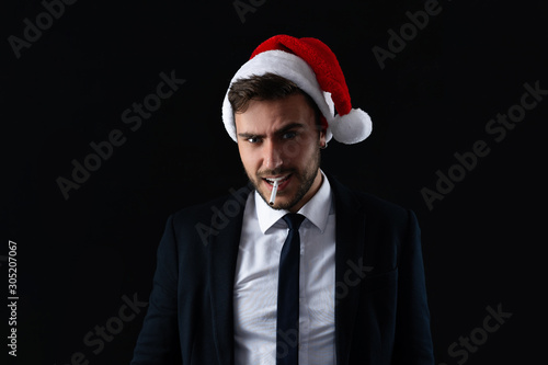 Young handsome caucasian guy in business suit and Santa hats stands on black background in studio with serious face and smoking cigarette