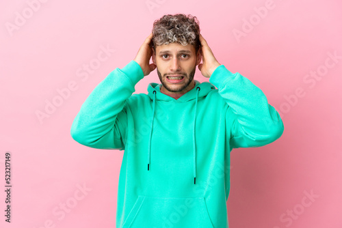 Young handsome caucasian man isolated on pink background doing nervous gesture