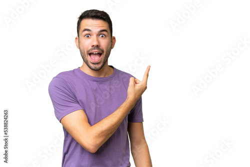 Young handsome caucasian man over isolated background surprised and pointing side