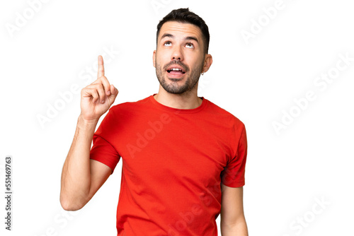 Young handsome caucasian man over isolated chroma key background pointing up and surprised