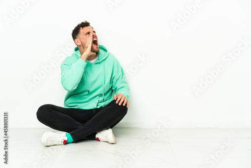 Young handsome caucasian man sitting on the floor shouting with mouth wide open to the lateral