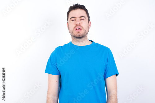 young handsome caucasian man wearing blue t-shirt against white background looking sleepy and tired, exhausted for fatigue and hangover, lazy eyes in the morning.