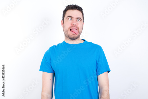 young handsome caucasian man wearing blue t-shirt against white background showing grimace face crossing eyes and showing tongue. Being funny and crazy