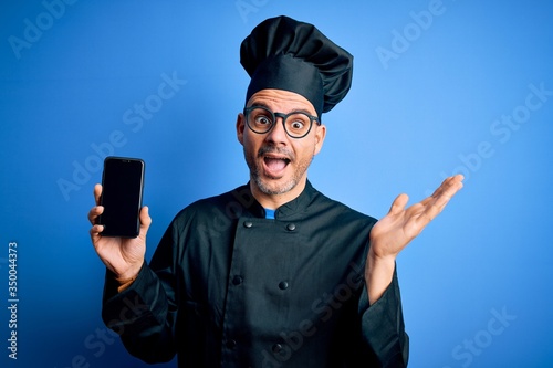 Young handsome chef man wearing uniform and hat holding smartphone over blue background very happy and excited, winner expression celebrating victory screaming with big smile and raised hands
