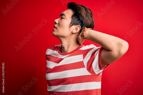 Young handsome chinese man wearing casual striped t-shirt standing over red background Suffering of neck ache injury, touching neck with hand, muscular pain
