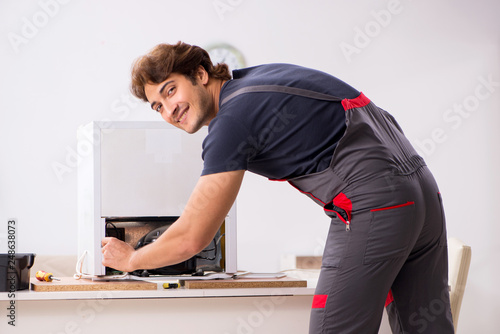 Young handsome contractor repairing fridge