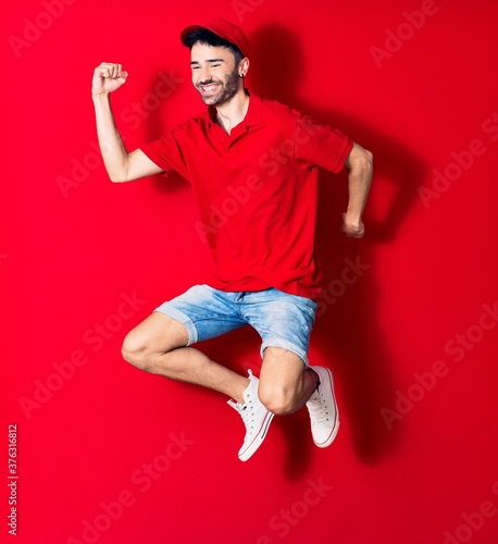 Young handsome deliveryman wearing cap smiling happy. Jumping with smile on face over isolated red background