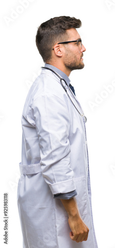 Young handsome doctor man over isolated background looking to side, relax profile pose with natural face with confident smile.