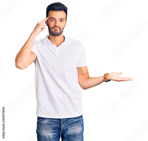 Young handsome hispanic man wearing casual clothes confused and annoyed with open palm showing copy space and pointing finger to forehead. think about it.
