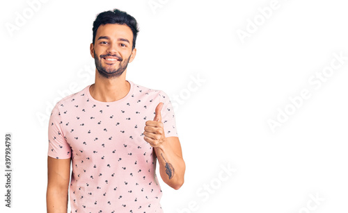 Young handsome hispanic man wearing casual clothes smiling happy and positive, thumb up doing excellent and approval sign