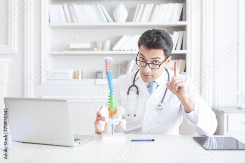 Young handsome male doctor orthopedist demonstrating the problem on spine bone model on the desk in his workplace