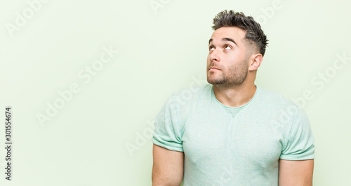 Young handsome man against a green background dreaming of achieving goals and purposes