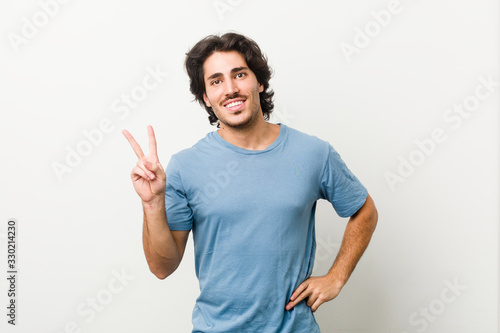 Young handsome man against a white background joyful and carefree showing a peace symbol with fingers.