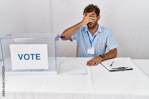 Young handsome man at political election sitting by ballot peeking in shock covering face and eyes with hand, looking through fingers with embarrassed expression.